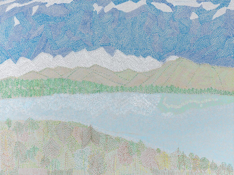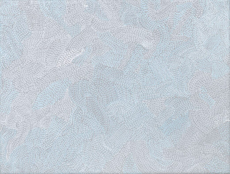 This corps of paintings takes its inspiration from landscapes that subtly enter the artist’s sensory realm from the periphery and ultimately become dreamscapes. Fascinated by the various bodies of water that kiss the land and embrace the sky in a multitude of settings during her travels, Minhas tends to first absorb these visual experiences and eventually reprocess them physically.
