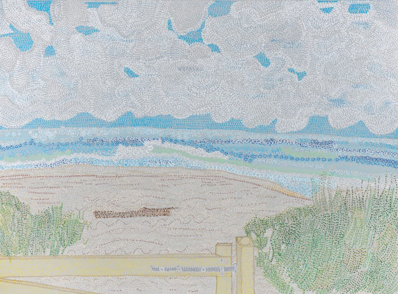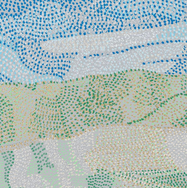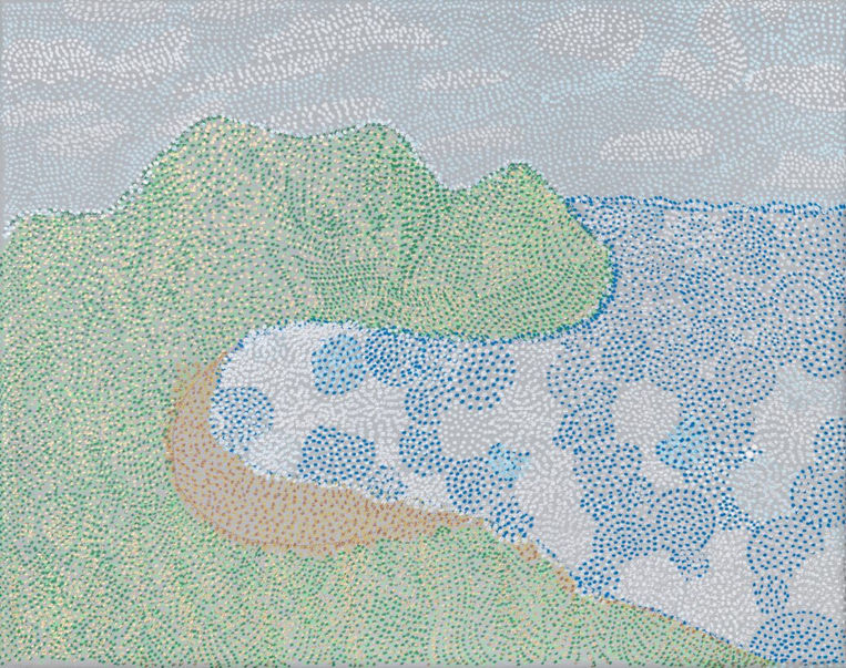 In the painting “Look At The World Through My Eyes”, the same three elements -sky, sea and landscape- invoke Minhas’ dreams. She creates a mosaic-esque surface, using tile-like reflective and matte details that softly swirl in sync with one another, to capture their etherealness onto a physical canvas.
