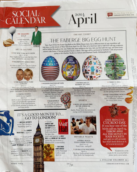 Volandes, Stellene. "The Fabergé Big Egg Hunt." Town & Country Magazine, April 2014, p. 32.